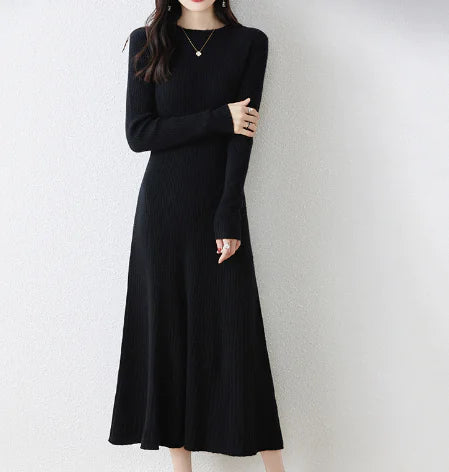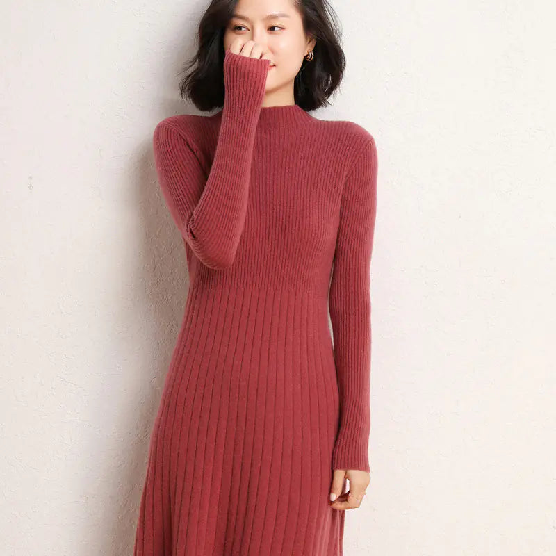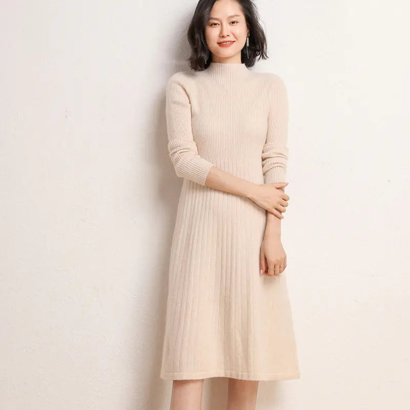 Featuring a trendy half-high collar and long sleeves, this knitted dress is ideal for layering or wearing alone. Its versatile design can be paired with your favorite boots or heels, making it a staple piece for both casual and formal settings.