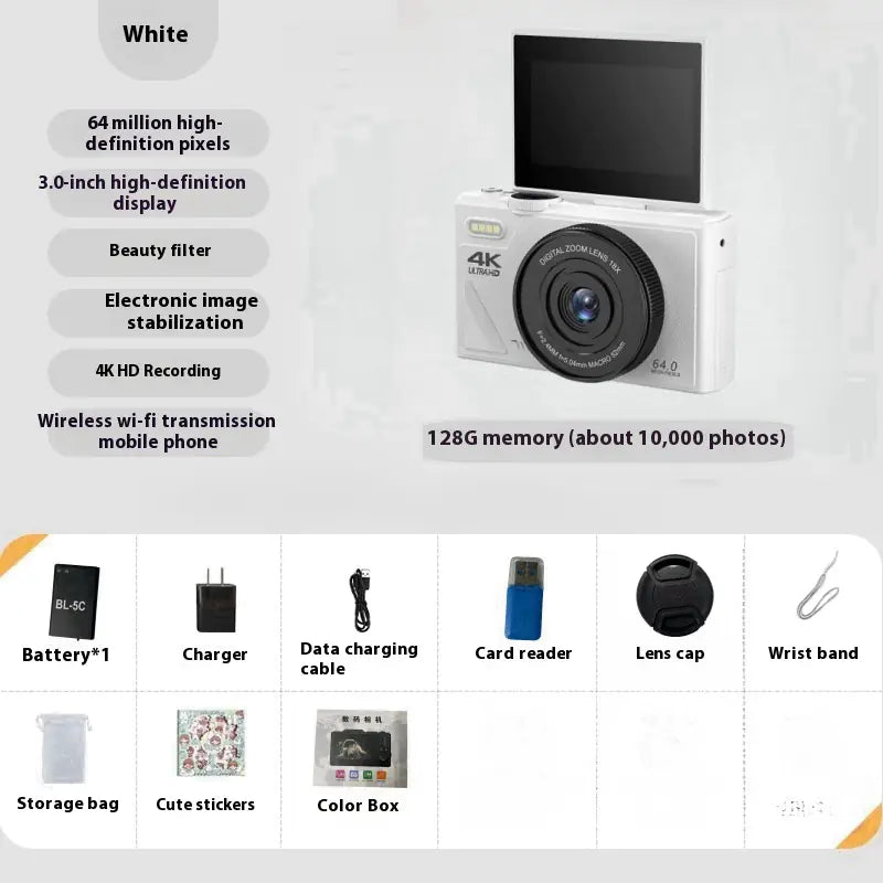 Capture stunning photos with this 64MP entry-level mirrorless CCD camera, perfect for students and beginners. Features a full HD screen, ABS body, and multiple memory options. Ideal for travel, selfies, and everyday photography.