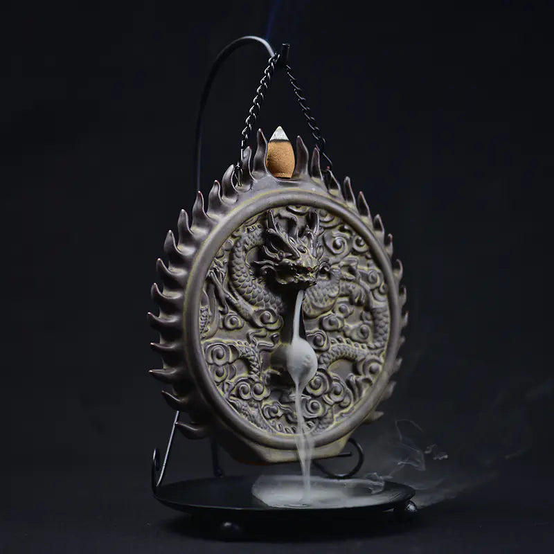 Measuring at a perfect height of 15 cm and a length of 25 cm, this incense burner showcases an intricately designed flying dragon that appears to exhale wisps of aromatic smoke, enhancing the visual appeal as well as the fragrant atmosphere in your home or meditation space.