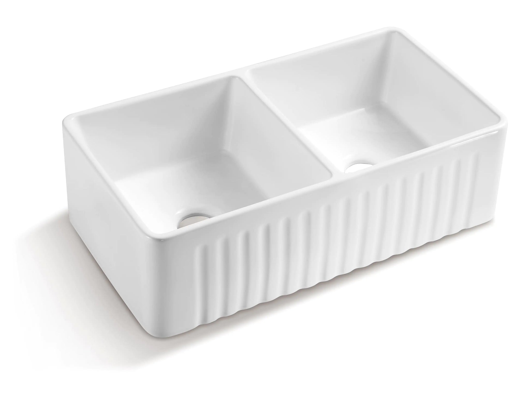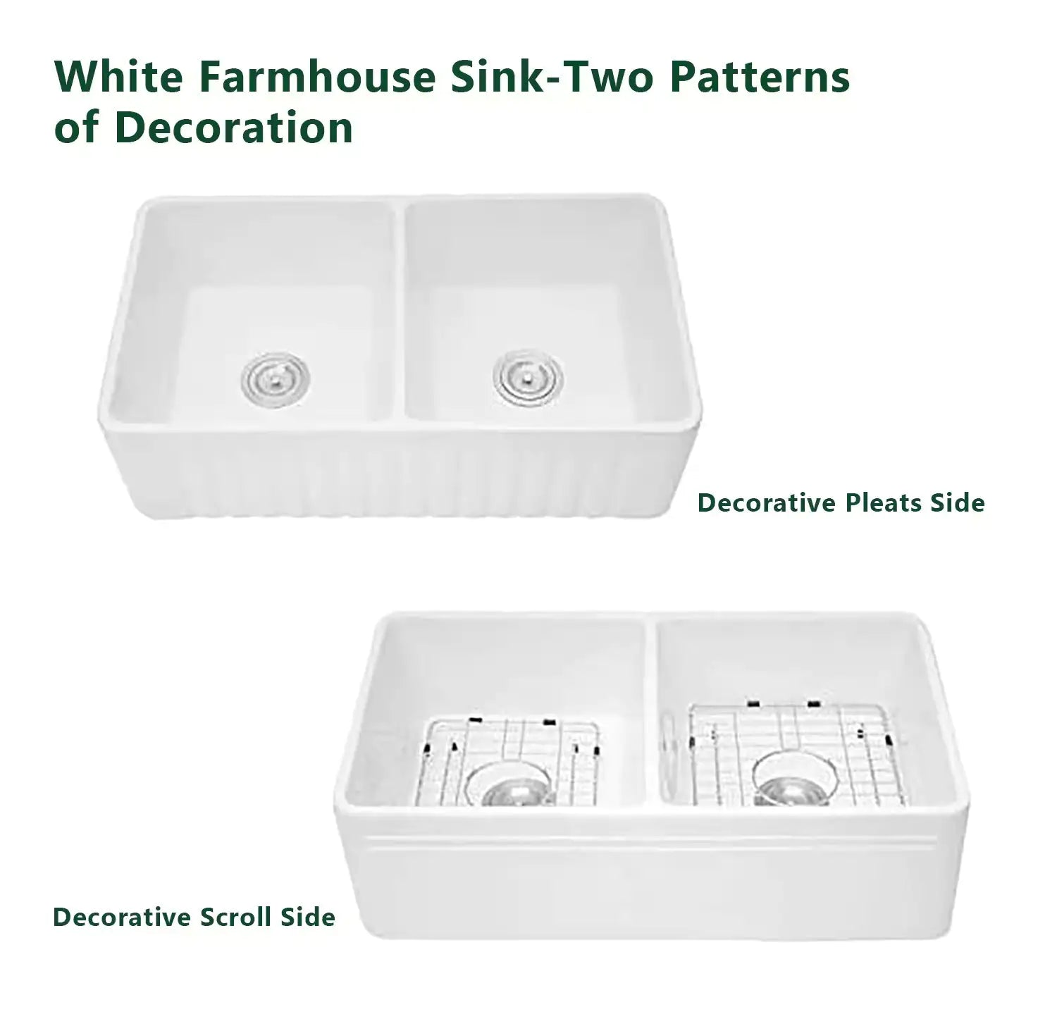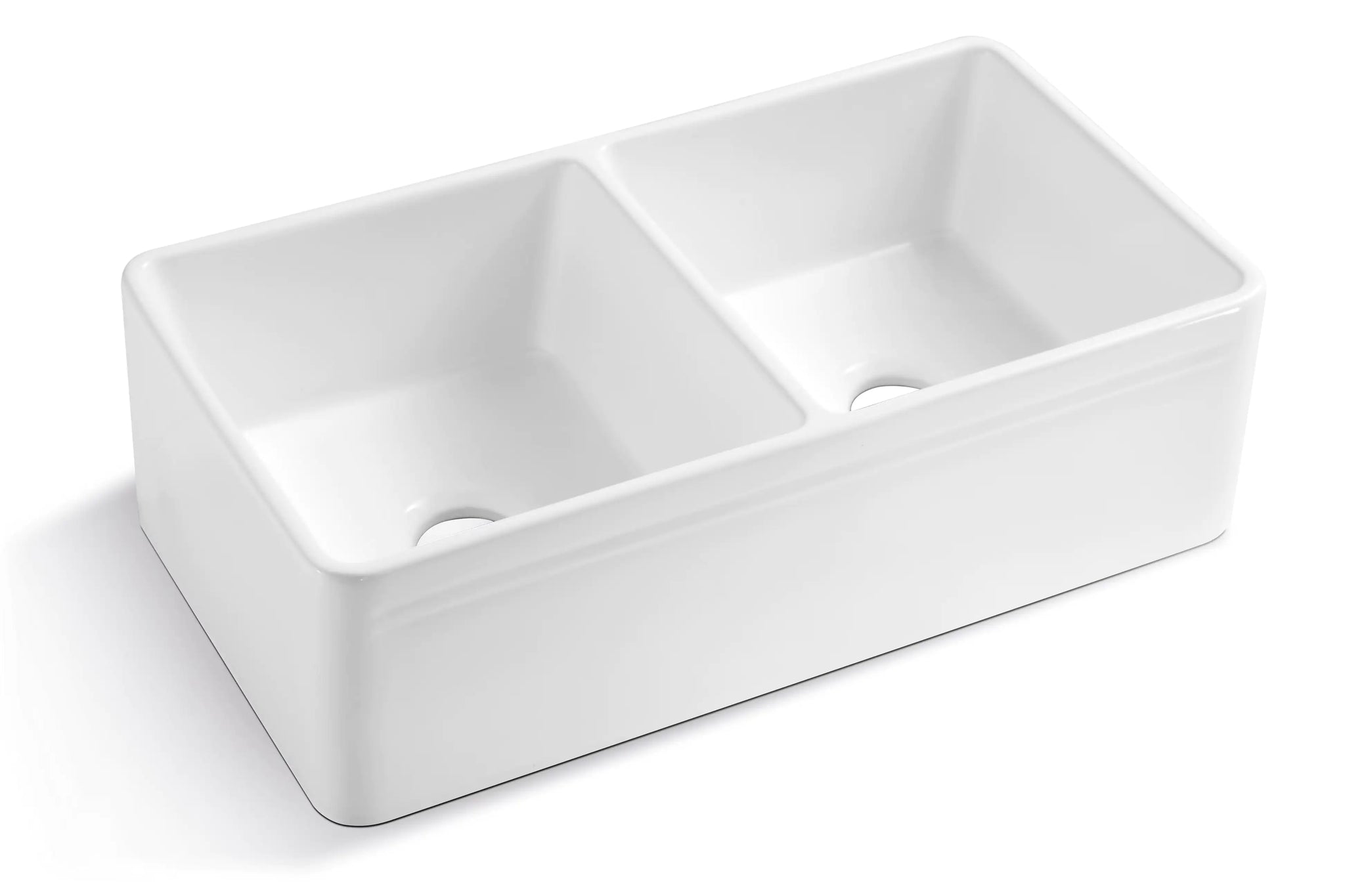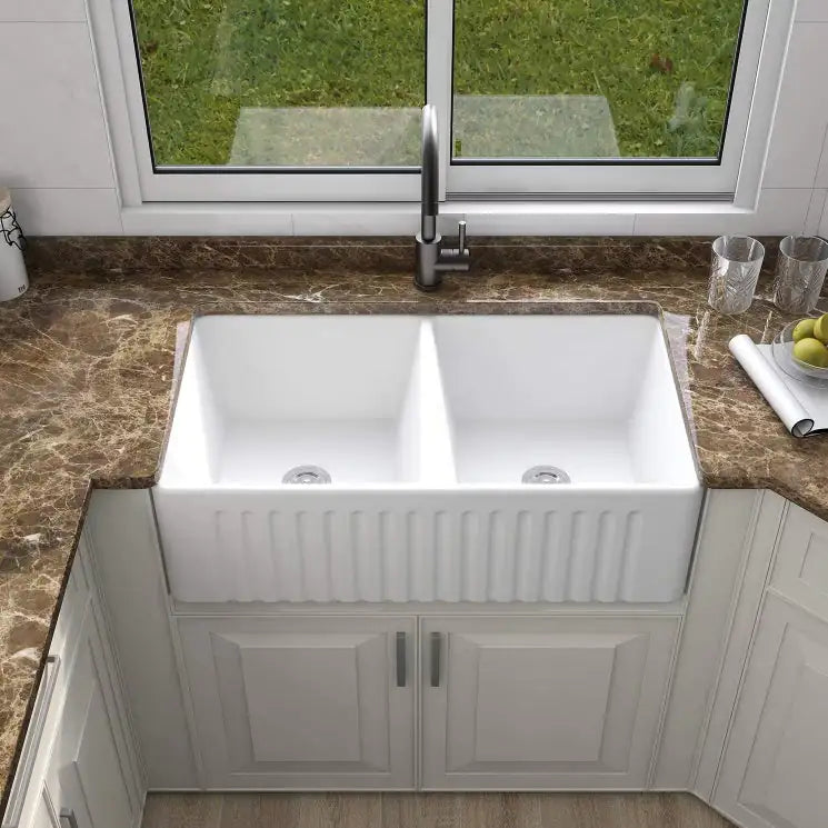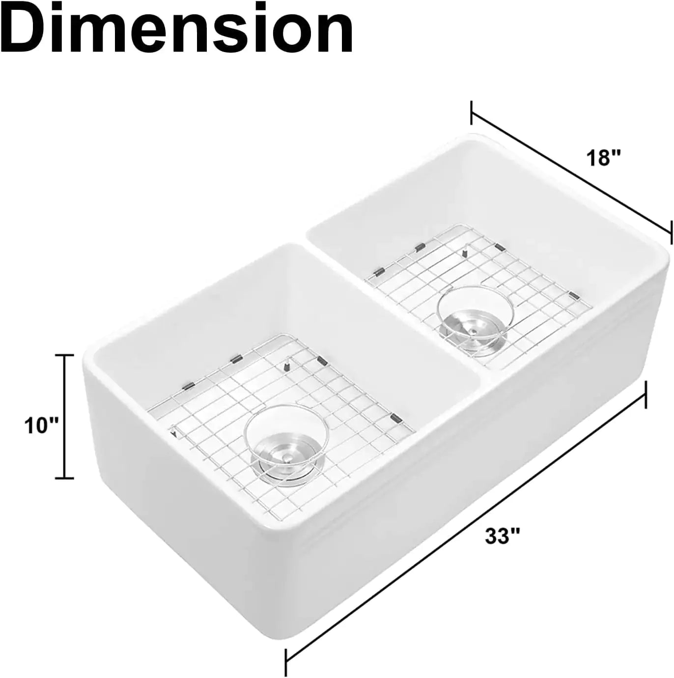 White in color, the kitchen sink is sharp, stylish, and features a convenient double-bowl design.Made of cast ceramic, the 33" kitchen sink is a durable addition to any home. The material's resistance to heat and scratches makes it perfect for a frequently used kitchen. Our products are inspired by vintage farmhouse sinks that create a distinctive clean look. It will not rust, fade, or discolor, providing beauty and durability.