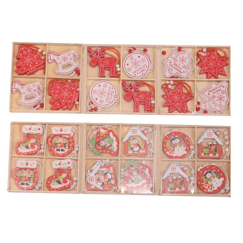 Our collection includes a variety of delightful designs that are sure to capture the spirit of the season. Choose from options like Q-G05 trees + Trojans, Q-G04 deer + round style, and many more, each available in sets of 12 pieces per box. Whether you prefer the elegance of stars, the whimsy of socks and gloves, or the charm of bells and wooden houses, we have the perfect ornament for your tree!