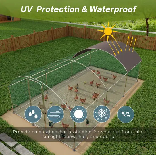 • No More Worrying: Give your chickens the ultimate outdoor protection with this large chicken run! Featuring a durable, sun-protective, and waterproof PE tarp, your feathered friends will stay dry and comfortable no matter the weather. The roof's clever pitch design ensures that water, debris, and light snow slide right off, preventing any accumulation. Your chickens will thank you for providing them with such a safe and cozy outdoor living space. Don't wait, upgrade their home now!