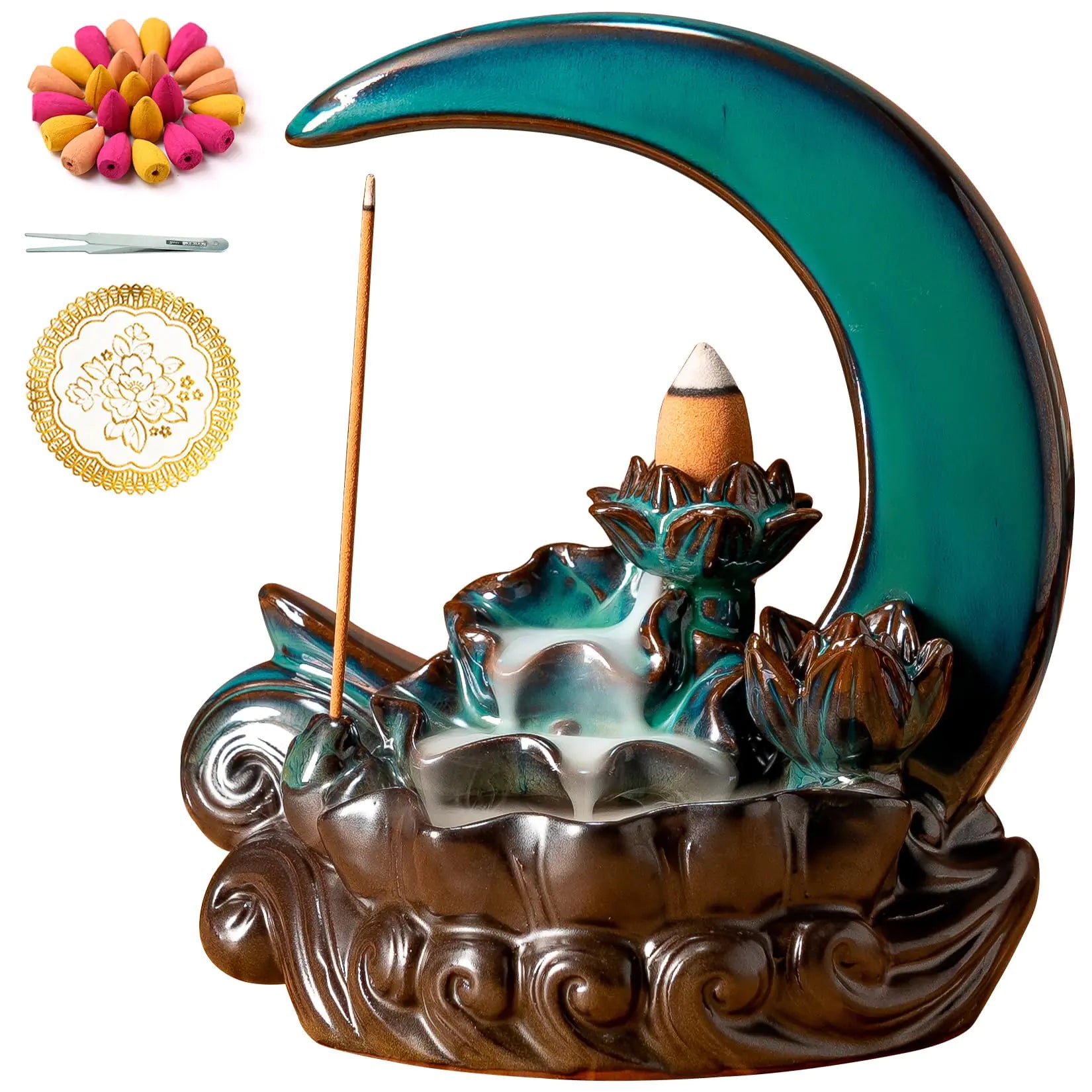 [☽ Well-designed: Our incense burner holder is meticulously handcrafted using high-quality ceramic featuring a unique combination of a moon and lotus leaf shape. When you light the incense cones it creates a captivating visual effect resembling a natural fountain waterfall. ☽ Multi-function: Our backflow incense burner is versatile and can be used with both incense cones and incense sticks. When the incense cones burn completely they create a magical waterfall of smoke releasing fragrance that create a mysterious and pleasant atmosphere. ☽ Package included: Our insence-stick holder set includes a moon-shaped incense burner 60 backflow cones and 30 incense sticks a metal tweezers and a mat. These complete accessories ensure convenient use of the incense burner. ☽ Application: The waterfall incense burner is suitable for various settings such as homes bedrooms living rooms studies kitchens offices yoga rooms meditation rooms and Zen rooms. It also serves as an ideal gift and decorative item for occasions like Christmas Thanksgiving Easter and other holidays. "☽ Customer Services: We prioritize providing the best services to our customers. If you encounter any issues with our incense burner please dont hesitate to contact us and we will promptly assist you. We are committed to replacing or refunding any defective products."]