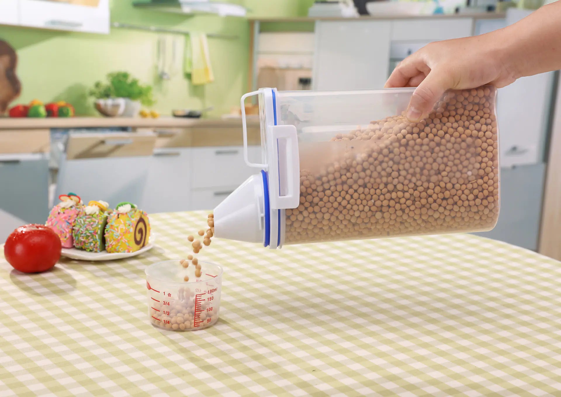Crafted with a built-in measuring scoop dispenser, you can easily measure out portions up to 1 cup, making it an ideal solution for portion control and minimizing waste. The snap-in place measuring cup and lid work together to keep your food fresher for longer, so you can enjoy your favorites without worrying about spoilage!