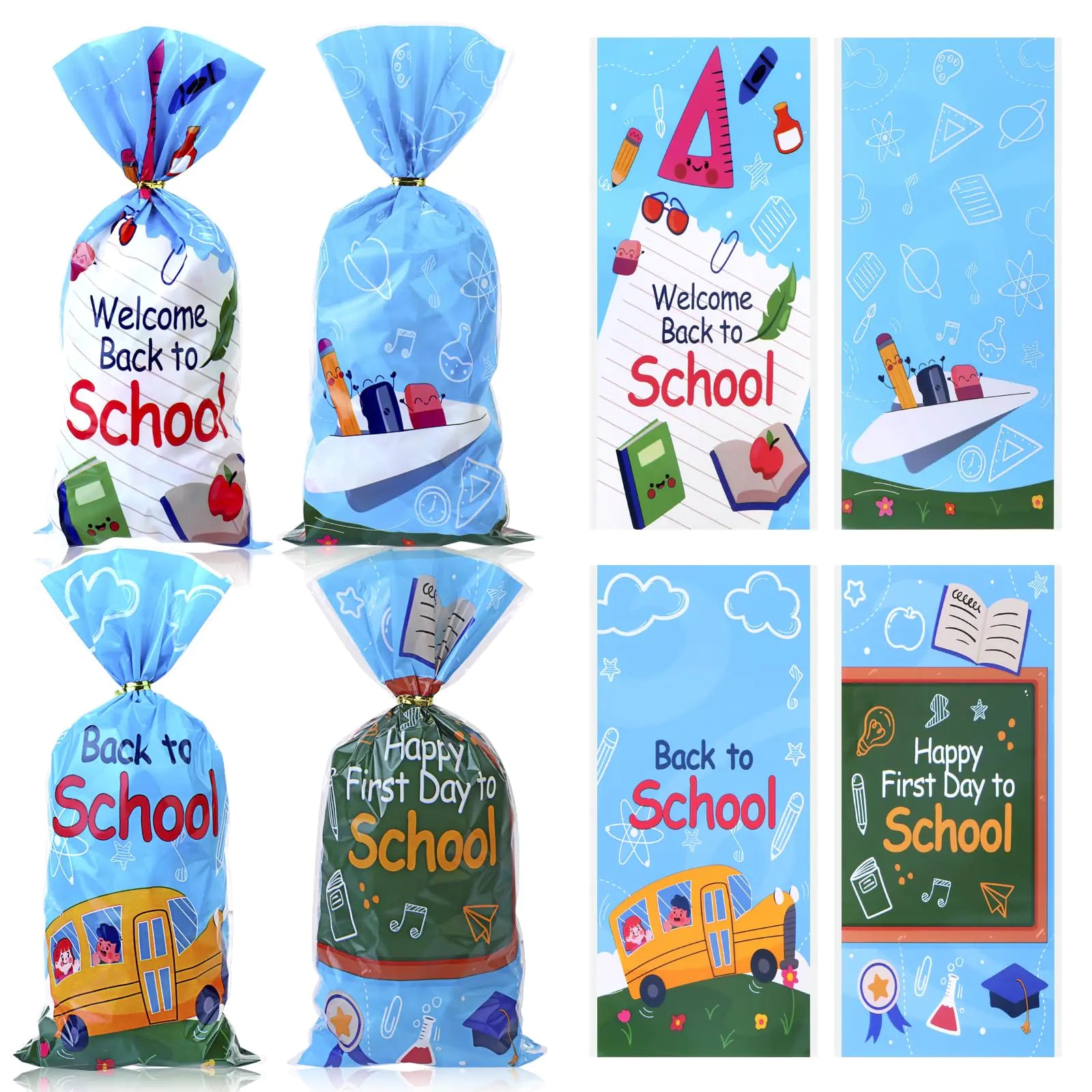 [Great Value Back to School Cellophane Bags Pack: 100pcs first day of school cellophane bags and 100pcs twist ties school themed clear goodie bags for Back to School Party Supplies come in 4 different designs and 25 of each enough quantity for you to complete welcome back to school party food supplies and decorations. Unique School Themed Design to Light Up Your First Day of School Party: Blue back to school treat bags are printed with 4 different cute designs blackboard textbook school bus pencil schoolbags globe ruler Apple and etc. printed with Happy First Day of School Welcome Back to School Back to School welcome your students and teachers and enjoy the happy time! Safe and Premium Material: The Back to School Party candy bags are made of oriented polypropylene (OPP) lightweight and sturdy do no harm to your health and can protect food well and keep your food fresh welcome to school snack bags are strong study not easy to break reusable on any school events school game and class activities! Large Capacity and Easy to Storage Food: Each back to school gift bags measures 27*13cm/10.6*5.1 inch can be filled with kids small back to school gift exquisite welcome back to school party favors candy goodie cookie snack donuts chocolate Come with gold ties to hold these favor bags secure and easy to carry! Wide Application Gift Bags Set: Our back to school party bags can be apply for first day of school party welcome back to school parties 100 days of school parties kids birthday parties school party school season party carnival party welcome party perfect Back to School Party supplies treat bags will be a big hit on first day of school party celebration!]
