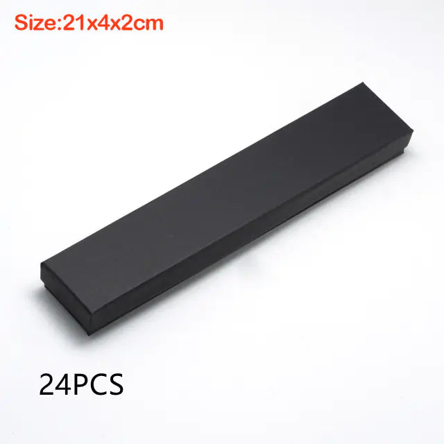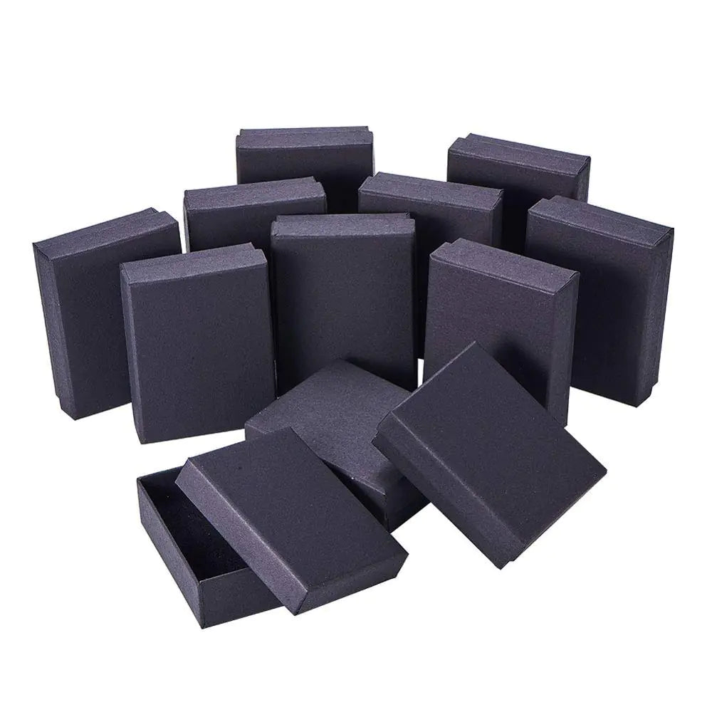 Durable black cardboard jewelry gift boxes in rectangular and square shapes. Available in multiple sizes, perfect for rings, necklaces, and sets. Sold in bulk packs of 18 or 24 pieces. Ideal for retail, gifting, or jewelry packaging.