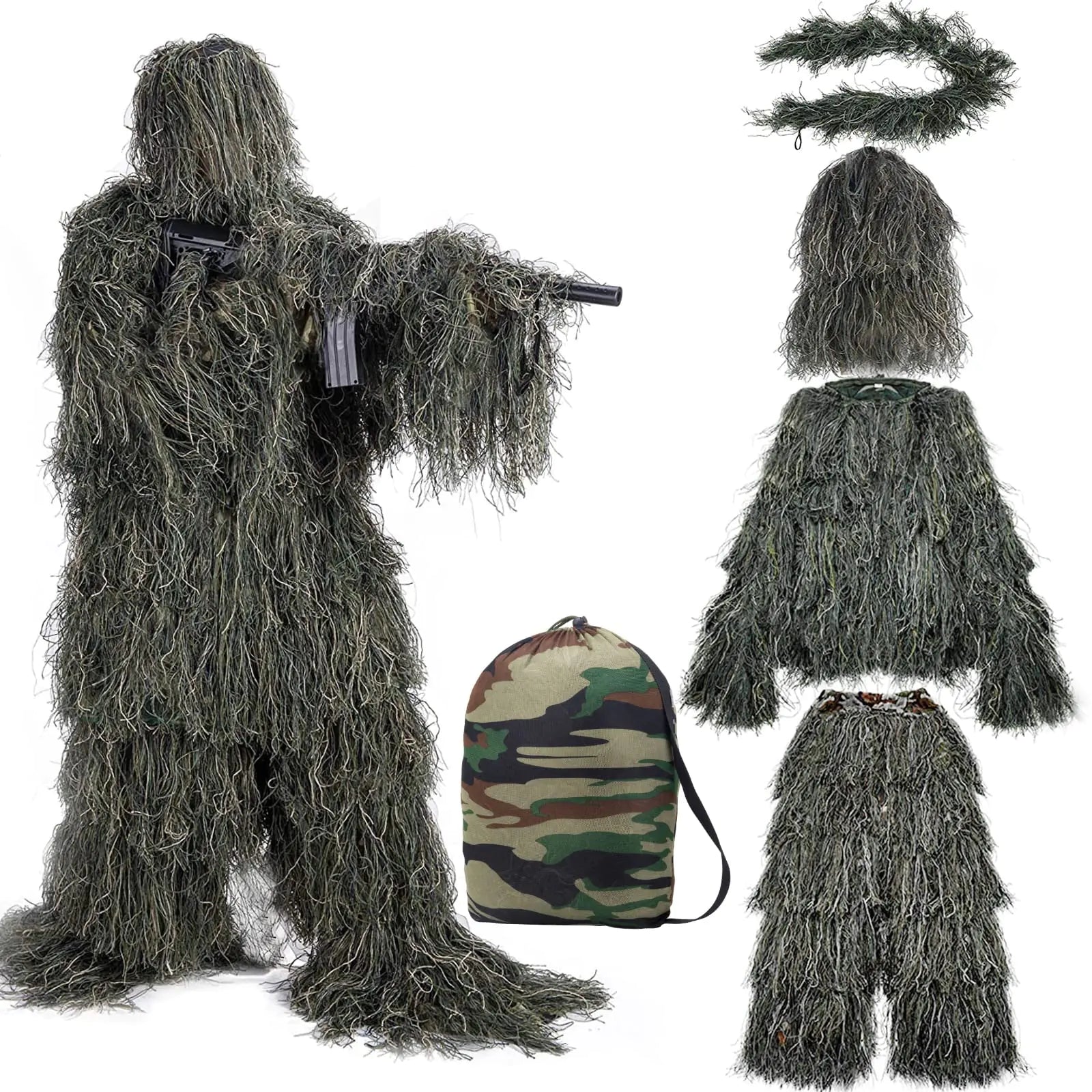 [5 Pcs in 1 Ghillie Suit Kit: Our ghillie suit comes with ghillie jacket pants hood ghillie rifle wrap and a carry bag 3 Sizes Available: Youth ( small for height 4\1\\ - 5\1" ) M/L size ( for 5\3" - 5\9" ) XL/XXL size ( 5\8" - 6\3" ). Please check the size chart (third picture) for more details Widely Used: Our ghillie suit is great for all situations where you need deep camouflage like hunting shooting stalking paintball airsoft surveillance wildlife watching or photography. It is a great halloween costumes too Built to Last: Our gilly suits are made of premium materials. The 7-color blend threads are great for forests and trees environment camouflage "Perfect Halloween Costume: Our ghillie suit kits are made of breathable and comfortable polyester fabric. Its eye-catching props for Halloween it will create a fun atmosphere for your Halloween"]
