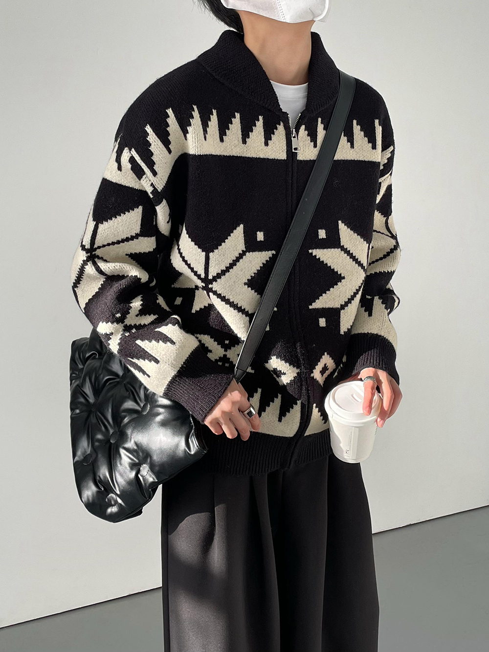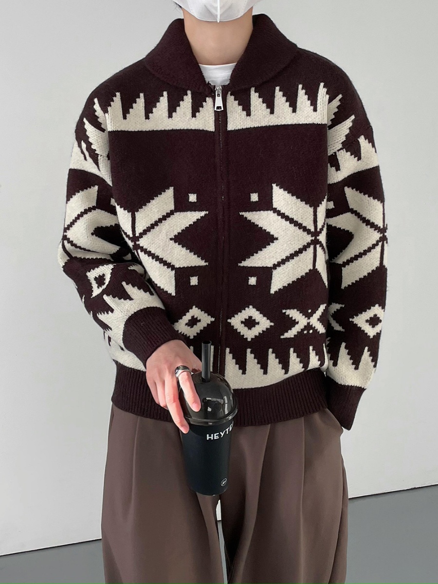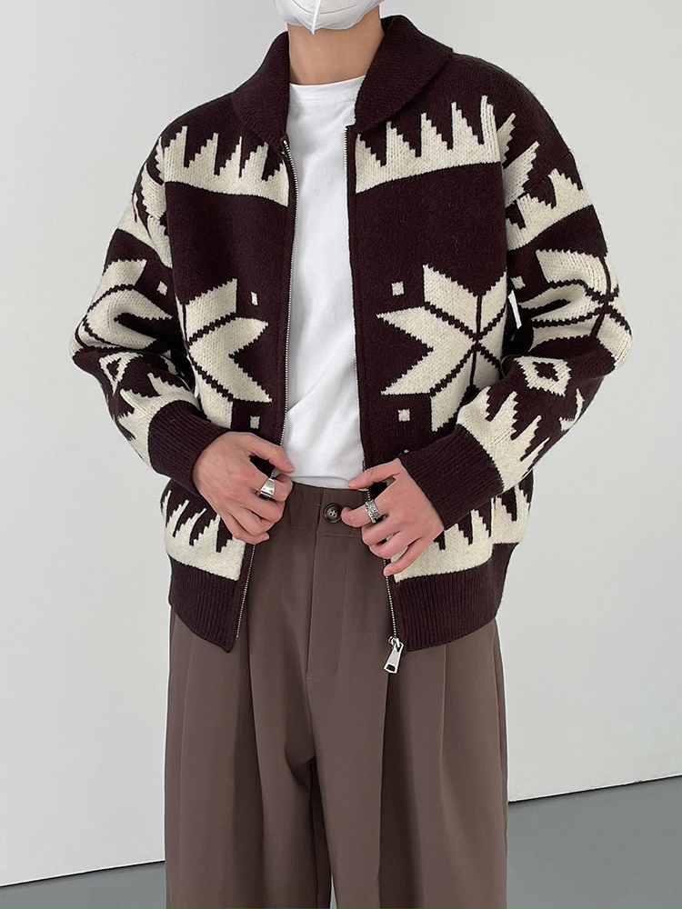 Discover the perfect blend of style and comfort with our Geometric Contrast Color Lapel Sweater Cardigan. This men's knitted jacket is crafted from high-quality artificial fiber, ensuring a soft and cozy feel while maintaining a sophisticated look.