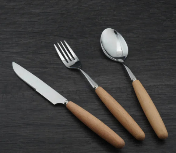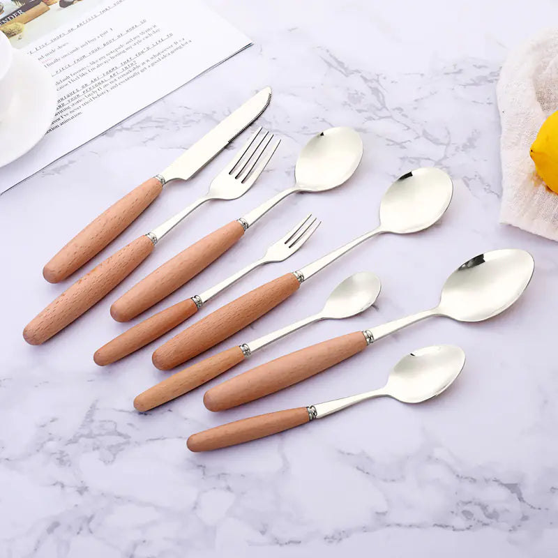 Elevate your dining experience with our exquisite stainless steel cutlery set, featuring beautifully crafted wooden handles. This set is designed not only for functionality but also to add a touch of elegance to your table setting.