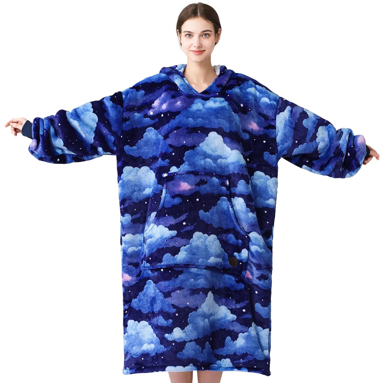 ["Ultimate Warmth & Comfort: Made from a premium Sherpa fleece lining and a soft flannel outer fabric the THREE POODLE long wearable blanket hoodie delivers full-body warmth and ultimate comfort. Designed to be 30% longer than standard styles it wraps you in cozy warmth from head to toe. Whether lounging at home or on the go its the perfect companion to snuggle up in" Oversized Fit For Everyone: Designed to fit all shapes and sizes our oversized hoodie blanket offers maximum comfort and flexibility. Available in a variety of fun and original patterns—featuring adorable animals strawberries and trendy tie-dye options catering to every style preference Exclusive Patent Design: Stay cozy and hands-free with the giant kangaroo pocket ideal for warming your hands or carrying essentials like your phone and remote. Elastic cuffs prevent slipping and block cold air while the spacious hood keeps your head warm. The playful poodle ears add a charming touch to brighten up any chilly day Easy Care & Maintenance: Simply toss this sherpa blanket hoodie in the washing machine for easy maintenance. Tumble dry on low and it’s ready for you to enjoy again. We highly recommend washing the hoodie before using it for the first time "Perfect Gift: THREE POODLE cozy and practical blanket sweatshirt makes an ideal gift for anyone—women men moms girlfriends and kids. Whether its for Christmas birthdays anniversaries or any special occasion our sweater blanket keeps your loved ones warm and cozy during the colder months"]