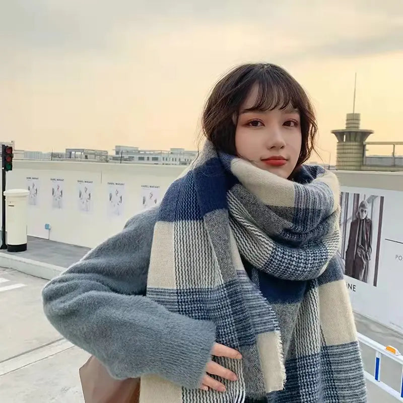 Embrace the chill of winter with our stylish and warm women's fashion scarf, designed to keep you cozy while making a statement. The blue-grey-beige plaid pattern adds a touch of elegance and versatility, making it the perfect accessory to complement any outfit.